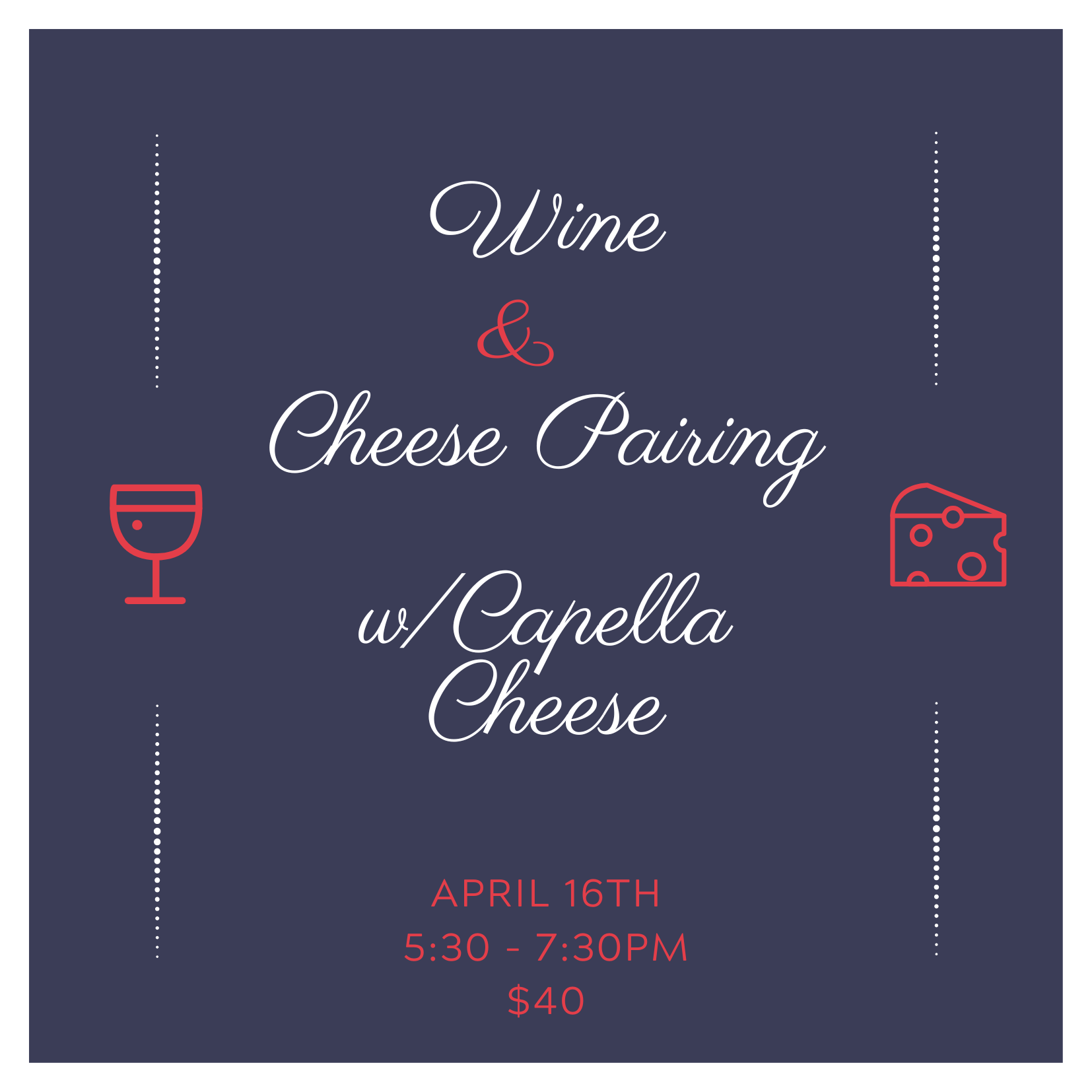 Wine and Cheese Tasting w/ Capella Cheese(0) $40.00 Excl. tax In stock Add to cartLogin for wishlistPay directShare Facebook WhatsappAdd to comparison list